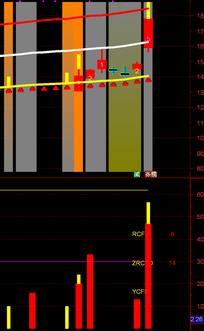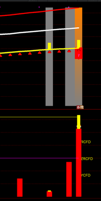 这种模式也是绝对确定的,灰色底色再次出现强化然后接着全橙色背景,K线上三条线的最下面黄色线,K线开始显示。K线为实心表示当日有主力资金净流入。下面红色柱子代表该股当日主力净流入在当日流入最多的300个股票中的排名前63名的排名顺序。