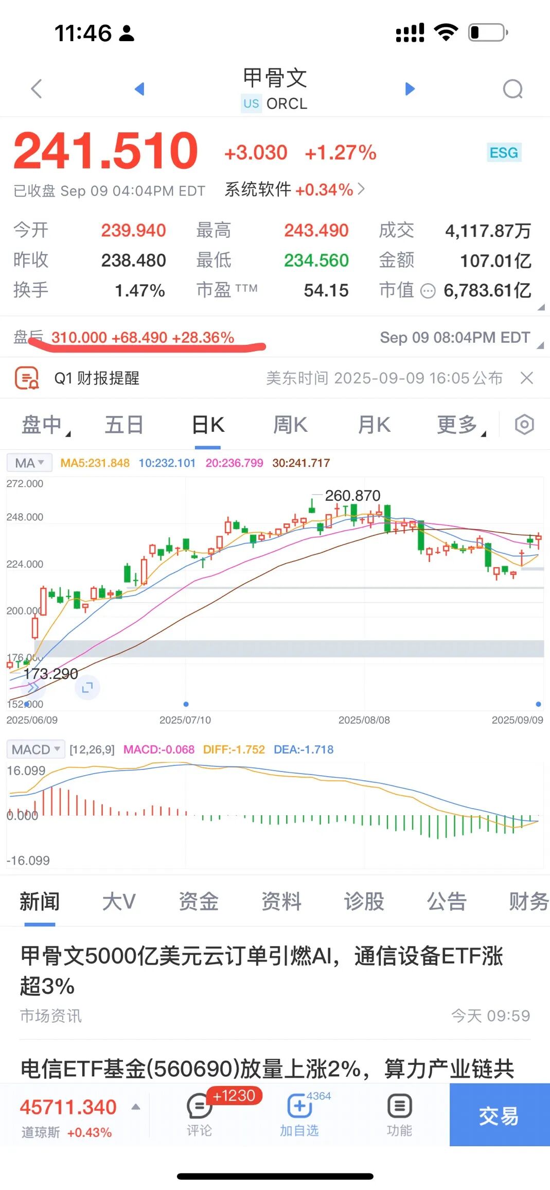 午间涨停一览: 略! 1,写之前先回答一个正经的问题,今天AI硬件大涨来源于甲骨文大涨28.36%,但是很多人搜索,比如你用同花顺,你输入甲骨文股价是1.27%,就有人问我了,这个甲骨文明明股价是1.27%,为什么新闻媒体说是28%,那这个28%从哪里看? 你可以通过以下几种方式查看: 1. 免费渠道 • Google Finance / Yahoo Finance 搜索股票代码(Oracle 是 ORCL),会显示 After Hours(盘后) 报价。 • 纳斯达克官网 nasdaq.com