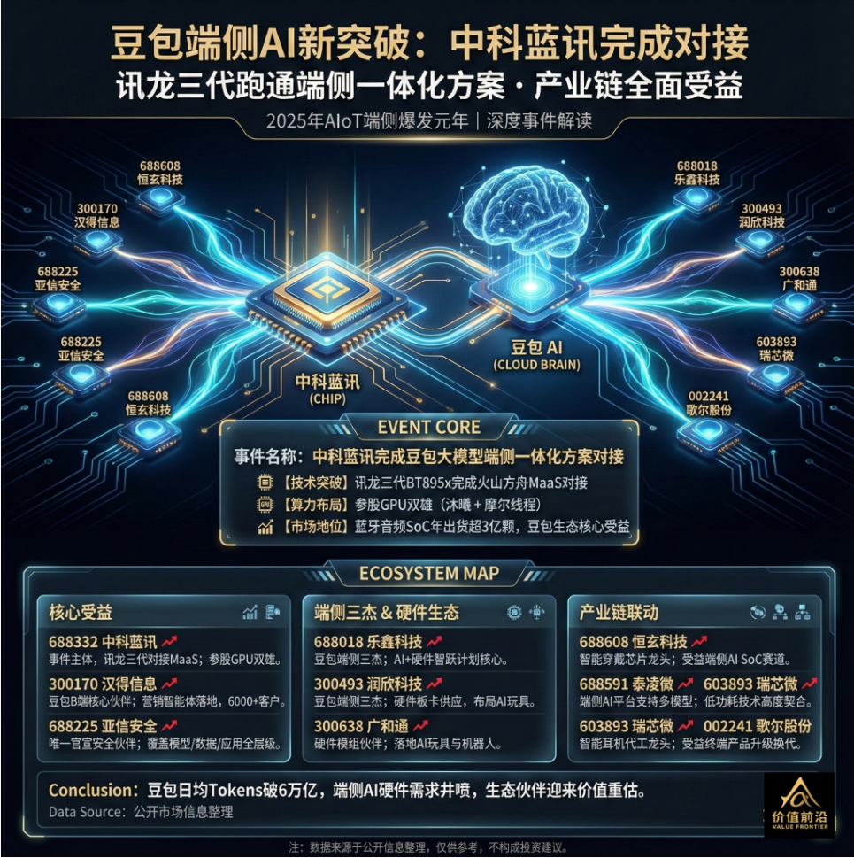 近日,中科蓝讯完成与字节跳动“豆包”大模型的端侧一体化方案对接,标志着端侧AI在2025年AloT领域迎来爆发元年。技术方面,中科蓝讯的讯龙三代芯片已成功对接火山方舟MaaS平台,并通过参股GPU企业沐曦与摩尔线程强化算力布局。作为蓝牙SoC年出货超3亿颗的行业龙头,中科蓝讯将成为豆包生态核心受益者。 围绕豆包端侧生态,产业链上下游企业同步迎来发展机遇。汉得信息作为豆包核心伙伴,已落地营销智能体并服务超6000家客户;亚信安全是唯一官宣的安全伙伴,提供全层级安全覆盖。硬件端形成“端侧三杰”,包括