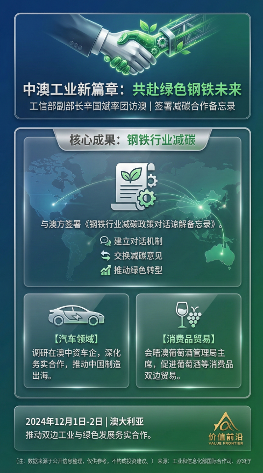 中国工业和信息化部副部长辛国斌率团访问澳大利亚,双方围绕工业合作与绿色发展展开务实交流,并达成一系列合作成果。 此次访问的核心成果是签署了《钢铁行业减碳政策对话谅解备忘录》,旨在建立常态化对话机制、交换减碳技术与政策意见,共同推动钢铁产业绿色低碳转型,标志着中澳在应对气候变化和工业减排领域迈出合作新步伐。 除钢铁行业外,代表团还深入调研了在澳中资汽车企业,探讨深化产业链协同与市场合作,助力中国制造汽车“出海”。在消费品贸易方面,中方与澳大利亚葡萄酒管理局主席进行会晤,双方同意继续促进包括葡萄酒在