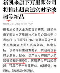 强瑞技术 (301128) 回答 投资者: 您好,公司已向新凯来供应超精密结构件产品,基于客户保密要求无法提供更多信息。请关注公司的定期报告,并注意投资风险。谢谢。 新凯来持有深圳市万里眼技术有限公司91.4706%的股份。 在10月15—17日举办的2025湾区半导体产业生态博览会上,深圳市万里眼技术有限公司将举办“万里眼 见所未见”2025新品发布会,重磅发布媲美国际级的新品——高速实时示波器。 本次展会集中亮相的产品包括: 时域产品:ExWave TS系列高速实时示波器、ExWave DG