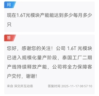 早在2025年二季度,它就为满足英伟达GB200平台的紧急需求,交付了10万只1.6T光模块,这也是该产品首次规模化交付。后续随着全球1.6T光模块需求爆发,11月有供应链消息显示,英伟达等海外巨头存在恐慌性下单情况,而新易盛作为该领域有力竞争者,不仅小批量供货英伟达,还在10 - 11月进入1.6T产品规模化量产阶段,泰国工厂的产能也在为交付提供支撑。此外,还有消息提到英伟达大幅加单1.6T光模块,新易盛的1.6T自有品牌和代工订单均有增加。 接下来16.T急单抢单消息可能越来越多 接下来16