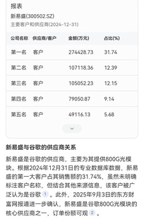 新易盛与谷歌的供应商关系 新易盛是谷歌的供应商,主要为其提供800G光模块。根据2024年12月31日的专业数据库数据,新易盛的第一大客户占其销售额的31.74%,虽然未明确标注客户名称,但结合其他来源信息,该客户被广泛认为是谷歌。此外,2025年9月3日的东方财富网报道进一步确认,新易盛是谷歌800G光模块的核心供应商之一,订单份额可观。 新易盛与谷歌的1.6T光模块合作情况 根据公开信息,新易盛是谷歌的800G光模块核心供应商,但目前尚未有官方渠道明确披露其向谷歌提供1.6T光模块的具体信息