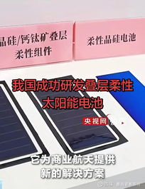 S天合光能(sh688599)S 「晶硅/钙钛矿叠层柔性太阳能电池」 商业航天又取得了新的技术运用突破!1月14日消息,央视新闻报道,我国科研团队取得重大技 术突破,成功研发出叠层柔性太阳能电池,主要解决了叠层柔性电池在效率与稳定性方面的核 心难题,让航天器和太空数据中心长期运行提供了电力保障。 央视新闻发布后,天合光能官网也发出了回应,接下了这个新技术新产品的 「晶硅/钙钛矿叠层柔性太阳能电池」就是我们的!助理商业航天发展! 今日(1月14日),天合光能(688599.SH)光伏科学与技术全国