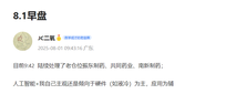下午没有交易依然拿着液冷x3(出海逻辑2、磁浮压缩机1) AI应用x1,全都是创业板 早盘一波基础上,下午应用有所发酵(在硬件今天偏修整的情况下) 关于比起硬件我乐意看成片的逻辑,应用我只愿意缩小范围到个股 这个我上午已经讲过了8.1午盘 刚才跟朋友说,自己对硬件执念更深,也更安心,比较希望的剧本是应用让它表演,但又表现出没有硬件热度罩着,就是细狗虚得很,还得是硬件,又呼呼呼回去